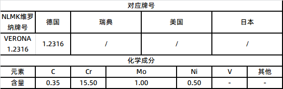 1.2316是马氏体不锈钢-铬钢,抗腐蚀性能佳,相比较1.2083等铬系有更高的耐腐蚀性,更佳的抛光和蚀刻性能。其应用于仪器设备,高度防腐蚀,抗高酸性能的塑料模具。